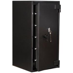 De DRS Euro Defender III/5 heeft als uitwendige afmetingen 1230 x 640 x 648 mm (HxBxD) en inwendig 1100 x 510 x 425 mm (HxBxD). De in hoogte verstelbare legborden maken het eenvoudig om de binnenkant van de kluis aan te passen aan uw opslagwensen. Bovendien is deze kluis voorbereid voor vloerverankering, wat zorgt voor extra stabiliteit en beveiliging. De stijlvolle zwarte kleur (RAL 9005) zorgt ervoor dat de kluis in elke omgeving past.